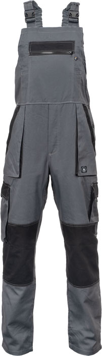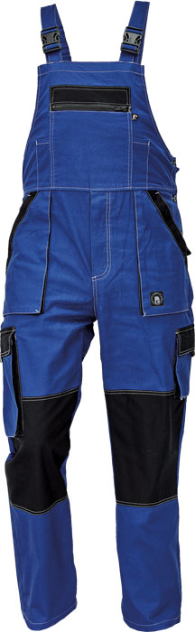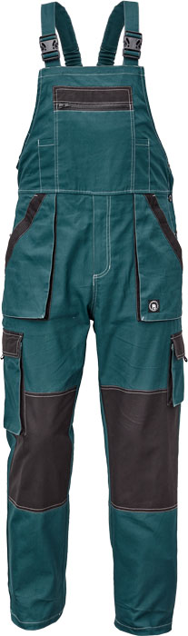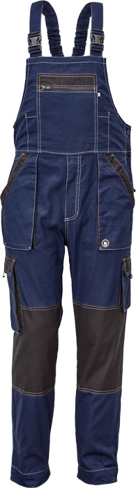 pánské lehké pracovní kalhoty s laclem a elastickým pasem; široké šle s plastovými sponami; 2 přední kapsy, 2 stehenní kapsy; 1 velká náprsní kapsa na zip, 2 zadní kapsy; zesílení nohavic v oblasti kolen.