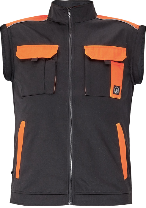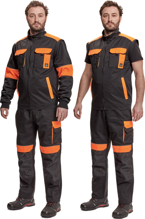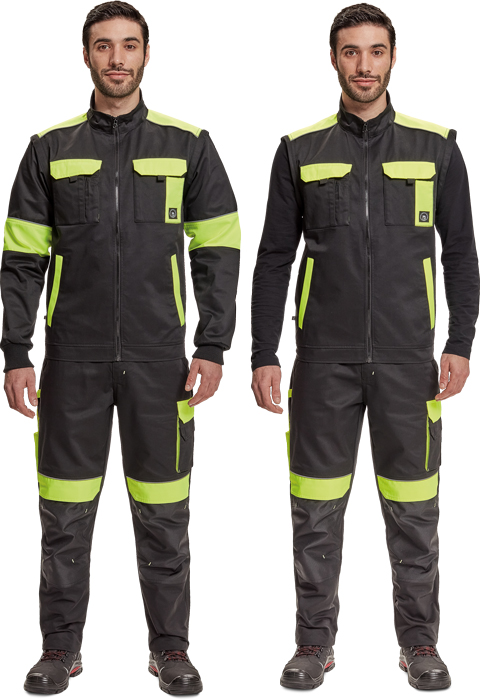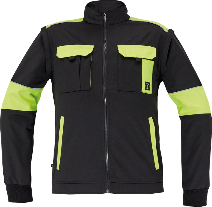 pánská pracovní bunda se zapínáním na zip; odepínatelné rukávy; 2 přední kapsy, 2 náprsní kapsy; zesílení namáhaných míst loktů a ramen; reflexní paspulky; pružné náplety manžet rukávů a elastický spodní obvod pasu.