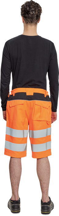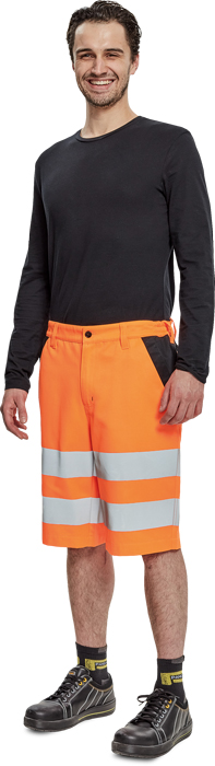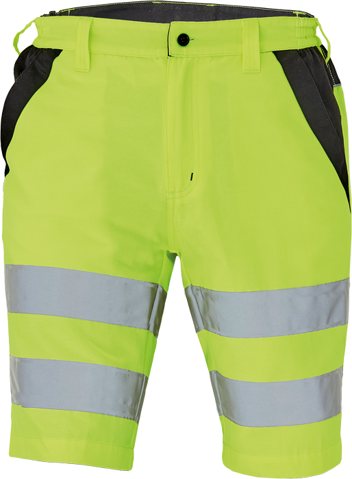 pánské HI-VIS pracovní šortky s elastickým pasem; 2 přední kapsy, 2 zadní kapsy; dvojice tištěných 7 cm reflexních pruhů po obvodu stehen; reflexní paspulky.