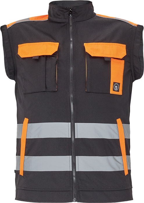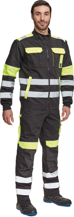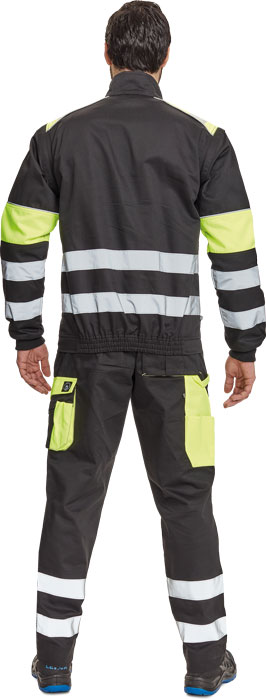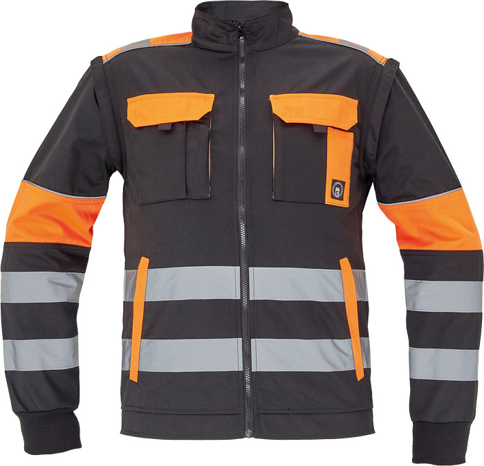pánská reflexní pracovní bunda se zapínáním na zip; odepínatelné rukávy; 2 přední kapsy, 2 náprsní kapsy; zesílení namáhaných míst loktů a ramen; dvojice našitých 5 cm reflexních pruhů přes spodní obvod pasu a rukávů; 2 menší pruhy přes ramena; reflexní paspulky lemující zesílené části rukávů a ramen; pružné náplety manžet rukávů a elastický spodní obvod pasu.