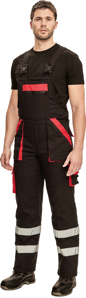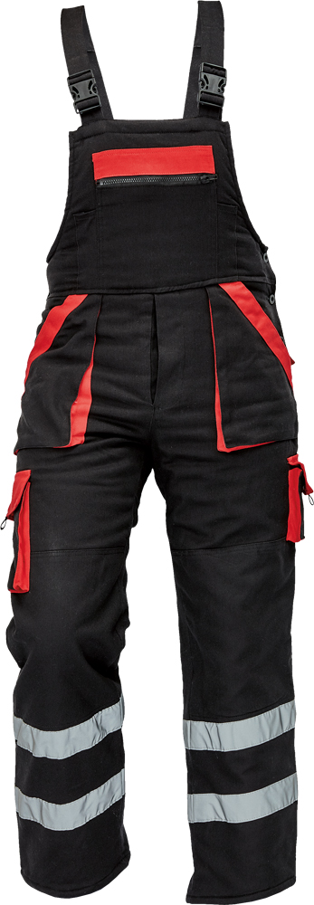 pánské zateplené pracovní kalhoty s laclem; široké šle s plastovými sponami; 2 přední kapsy, 2 stehenní kapsy; 1 velká náprsní kapsa na zip, 2 zadní kapsy; reflexní pruhy po odvodu spodních nohavic; zesílená oblast kolen.