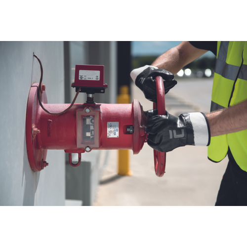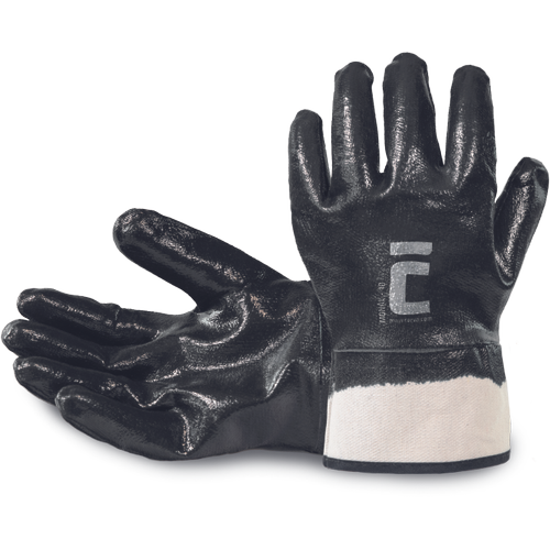 Rukavice šité z bavlněného úpletu, celomáčané v černém nitrilu, s pevnou manžetou.