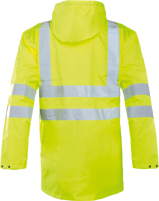 hi-vis nepromokavá a větruodolná bunda s excelentní prodyšností dle EN343 v nejvyšší třídě 3 lehká a velmi pevná konstrukce oděvu zajišťuje vysoký komfort při práci; celopropínací přední zip překrytý légou s uchycením na plastové druky; možnost stažení v pase; větrací otvory v podpaží