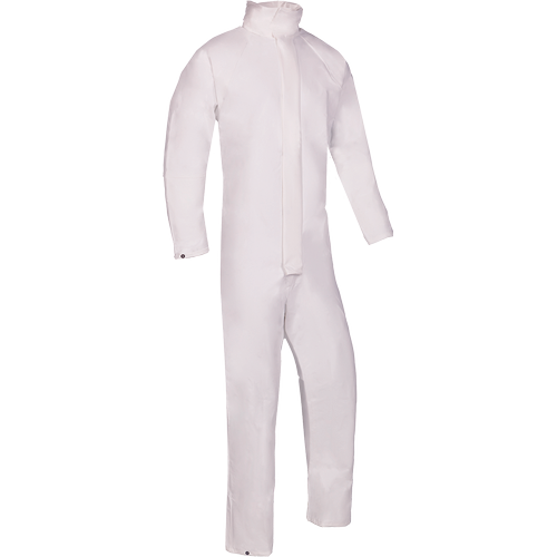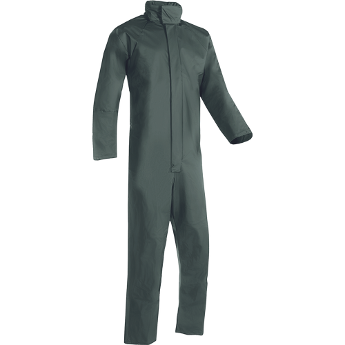 nepromokavá kombinéza s kapucí v límci; zapínání na zip překryté klopou s druky; zatavenými švy; elastická záda v pase, manžety rukávů a spodní okraj nohavic se zapínáním na druky.
