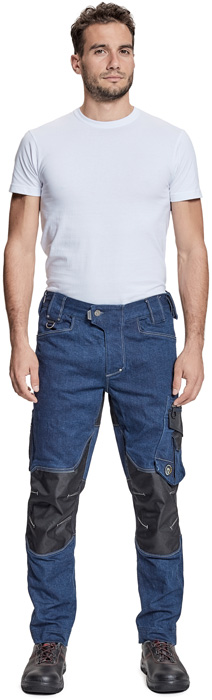 pánské pracovní kalhoty, elastická předepraná denim látka, slim střih, snížený pružný pas, odolné trojité prošití nohavic a sedu, CORDURA a TRIFIBETEX zesílená oblast kolen, prostorné multifunkční přední kapsy s poutky na nářadí, 2 zadní kapsy, stehenní kapsa na telefon s klopou a zapínáním na suchý zip, kapsa na metr a nůž, poutko na kladivo, "D" kroužek, poutko na nářadí v pase, originální zpracování zapínání kalhot, nastavitelná délka nohavic.