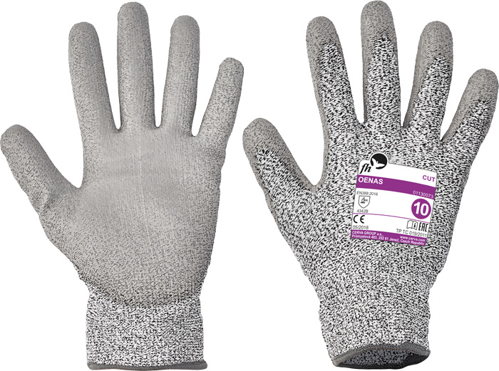 Pletené bezešvé rukavice s obsahem vlákna DYNEEMA a nylonu s vysokou odolností proti prořezu ostřím, s vrstvou šedého PU v dlani a na prstech.