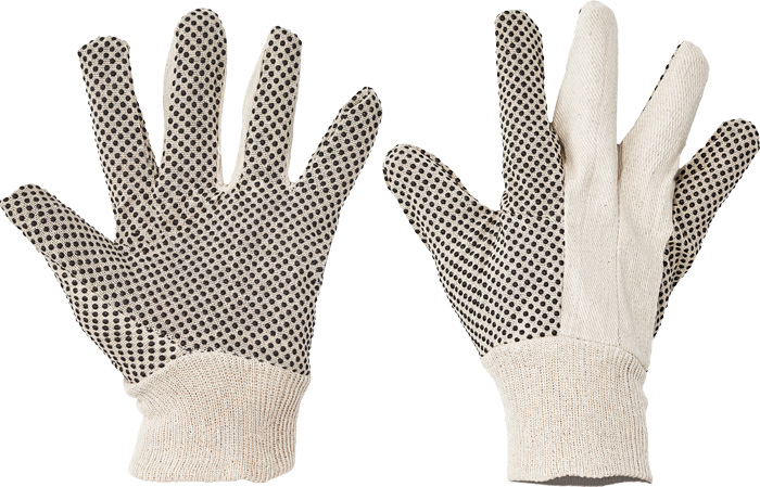 Rukavice šité z bavlněného plátna, s PVC terčíky v dlani a na prstech a pružným nápletem.