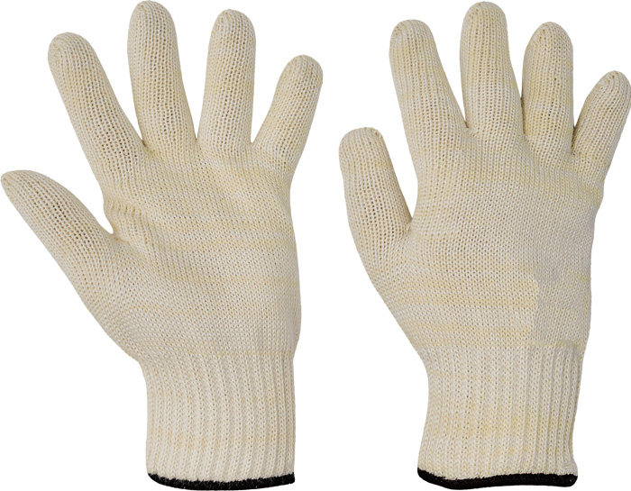 Dvouvrstvé rukavice ze speciálních materiálů Nomex (85 %) a Kevlar (15 %) na vnější části a 100 % bavlnou uvnitř, s ochranou před kontaktním teplem do 350 °C, v celkové délce 27 cm.
