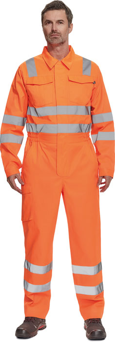 pánský full Hi-Vis pracovní overal s retroreflexním pruhy přes ramena, v bocích, na rukávech a nohavicích, elastický pas, zapínání na zip kryté légou na suchý zip, 2 postranní kapsy + 1 kapsička na drobné, 1 multifunkční stehenní kapsa, 2 náprsní kapsy s klopou, 2 zadní kapsy, nastavitelná délka nohavic