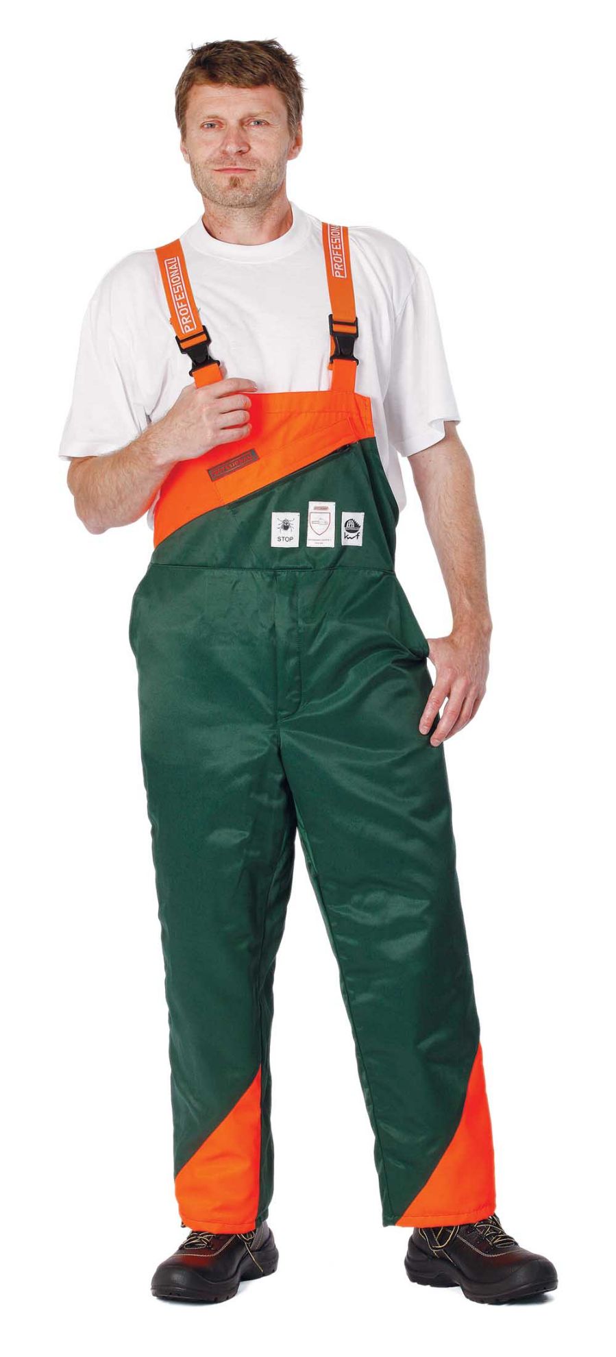 • vnitřní protipořezová vložka ve předu od pasu až po konec nohavic • nastavitelná délka • zapínání na plastovou sponu • náprsní kapsa na zip • zapínání z boku na zip a knoflíky • zadní našitá kapsa s klopou na suchý zip • kapsa na skládací metr