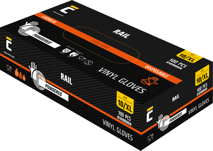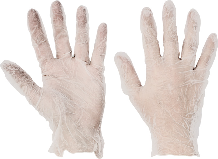 Jednorázové vinylové pudrované rukavice vhodné pro krátkodobý styk s netukovými potravinami.