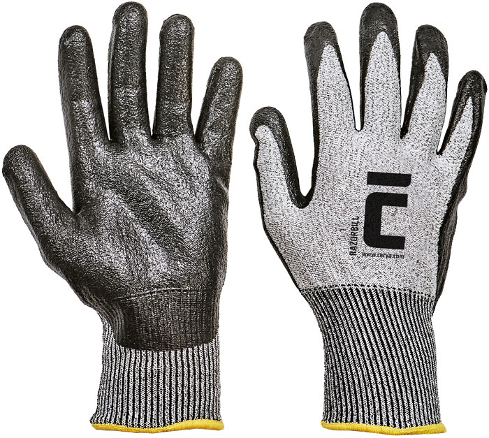 Pletené bezešvé rukavice z modifikovaného skleněného vlákna, Spandexu a nylonu, s nánosem HCT nitrilu v dlani a na prstech a odolností proti prořezu tř. C.