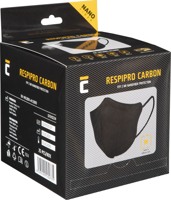 Antivirový nano respirátor FFP2 RespiPro Carbon zajišťuje díky nanovlákenné membráně záchyt virů, bakterií, prachu, smogu, pylu a al ergenů. Vrstva aktivního uhlí - carbonu eliminuje pachy. Respirátor má unikátní anatomický tvar, díky kterému perfektně padne na obličej a nedochází tak k nežádoucímu podsávání vzduchu. Ideální volba pro profesionály v povoláních, která kladou důraz na bezpečnost, jako jsou zdravotníci, záchranáři, hasiči, vojáci či policisté. Pro lepší přizpůsobení využijte plastovou sponu na sepnutí gumiček za hlavou, která je součástí balení. Dostupný ve dvou velikostech (M, L) a dvou baleních (3 kusy, 25 kusů).