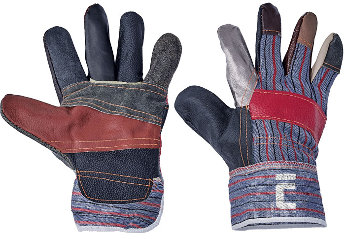 Rukavice z lícové nábytkové hověziny v dlani s podšívkou a z bavlněné tkaniny na hřbetu a manžetě.