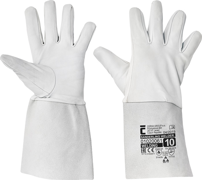 Celokožené rukavice z lícové kozinky s 15 cm širokou manžetou z hovězí štípenky. Certifikát: svářečské práce - typ B