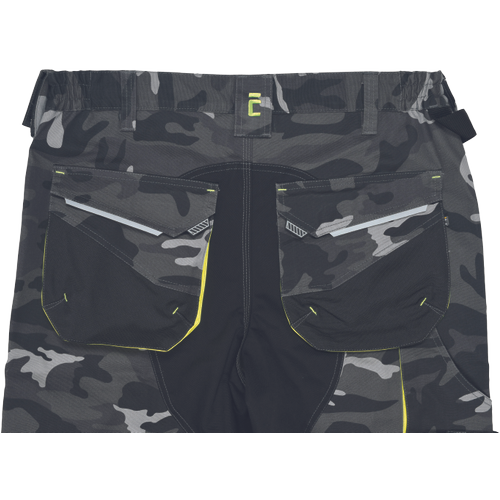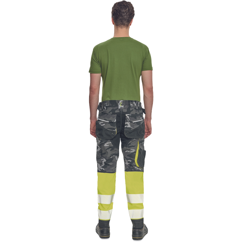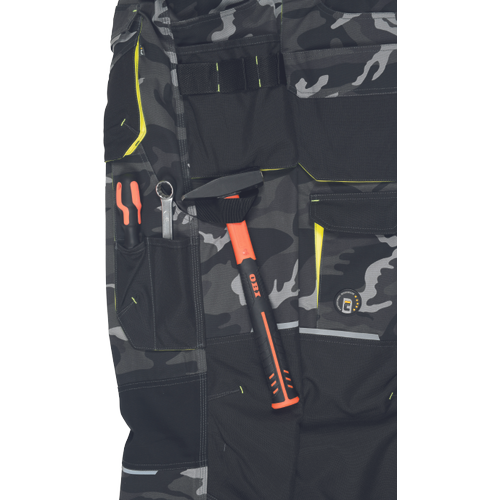 pánské pracovní HI-VIS kalhoty s pružným pasem a multifunkčními kapsami; v moderní úpravě šedé kamuflážové barvy; Oxford 600D zesílení kolenních kapes pro vkládání ochranných nákoleníků; odolné trojité prošití nohavic a sedu; 2 tištěné reflexní segmentované 7 cm pruhy na spodní části nohavic; nastavitelná délka nohavic.