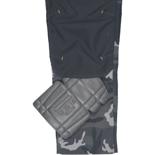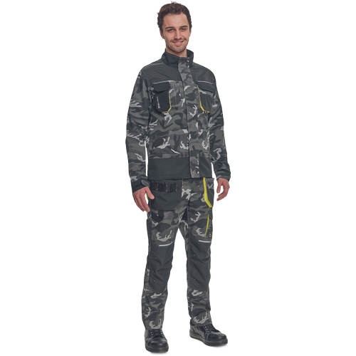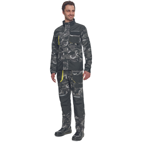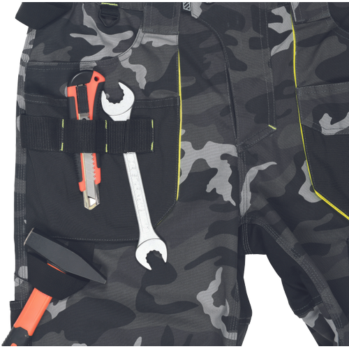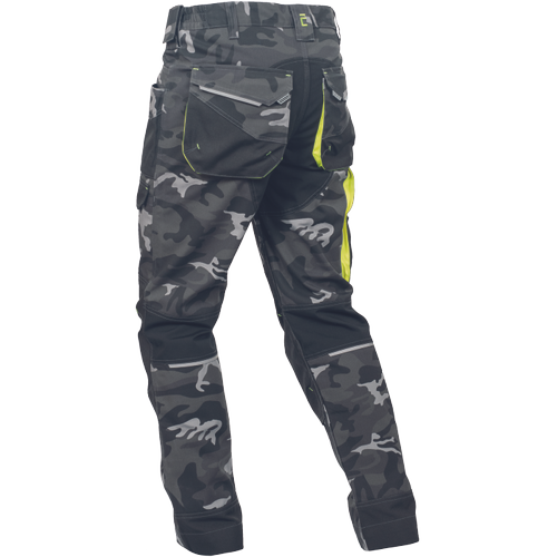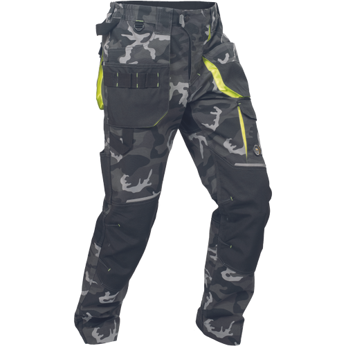 pánské pracovní kalhoty s pružným pasem a multifunkčními kapsami; v moderní úpravě šedé kamuflážové barvy; Oxford 600D zesílení kolenních kapes pro vkládání ochranných nákoleníků; odolné trojité prošití nohavic a sedu; reflexní prvky; nastavitelná délka nohavic.