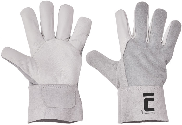 Celokožené rukavice bez podšívky ze světlé lícové hověziny v dlani, šedé hovězí štípenky na hřbetu, s tuhou 7 cm širokou manžetou.