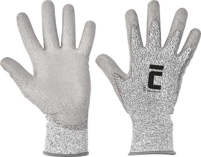 Pletené bezešvé rukavice kategorie prořezu B, šedý PU na dlani a prstech.