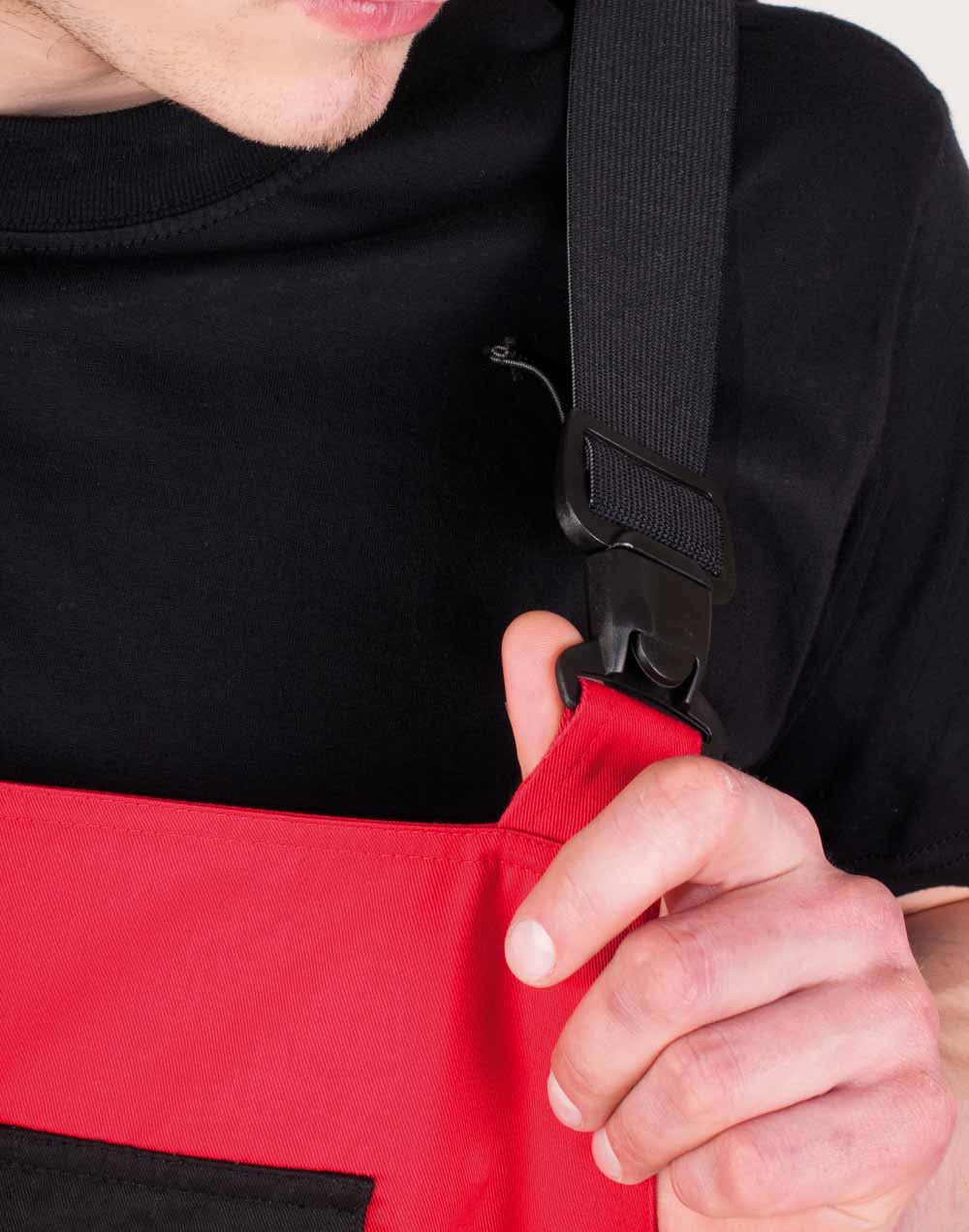 pánské pracovní kalhoty s laclem a elastickým pasem; olejivzdorná a voděodolná impregnace; 6 funkčních kapes; pružné šle s plastovými sponami; reflexní pruhy.