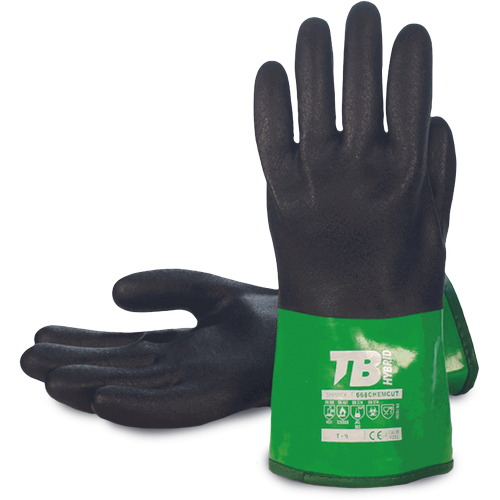 • zeleno-černá PVC dvojitá máčená rukavice • podšívka z para-aramidu a skelného vlákna • celková délka: 30 cm