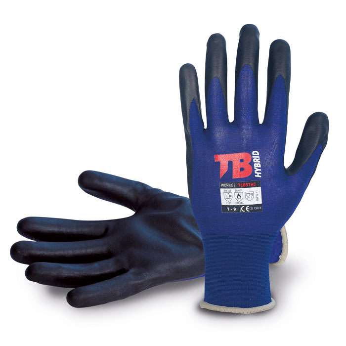 • modré bezešvé nylonové rukavice s uhlíkovým vláknem a elastanem máčené v PPU v dlani a prstech • neobsahují silikon a DFM • pletená manžeta • hustota úpletu 18 GG • odpor = 10^5 Ohm