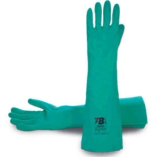 • zelené nitrilové rukavice • uvnitř lesklý povrch • rovná manžeta • tloušťka: 0,50 mm • celková délka: 45 cm • potah z nitrilové pryže, který má dobrou odolnost proti olejům, mazivům, vedlejším ropným produktům, chemikáliím, kyselinám a neketonickým rozpouštědlům