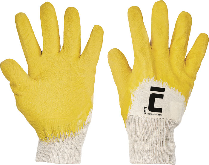 Rukavice šité z bavlny, polomáčené v přírodním latexu, s protiskluzovou úpravou v dlani a na prstech.