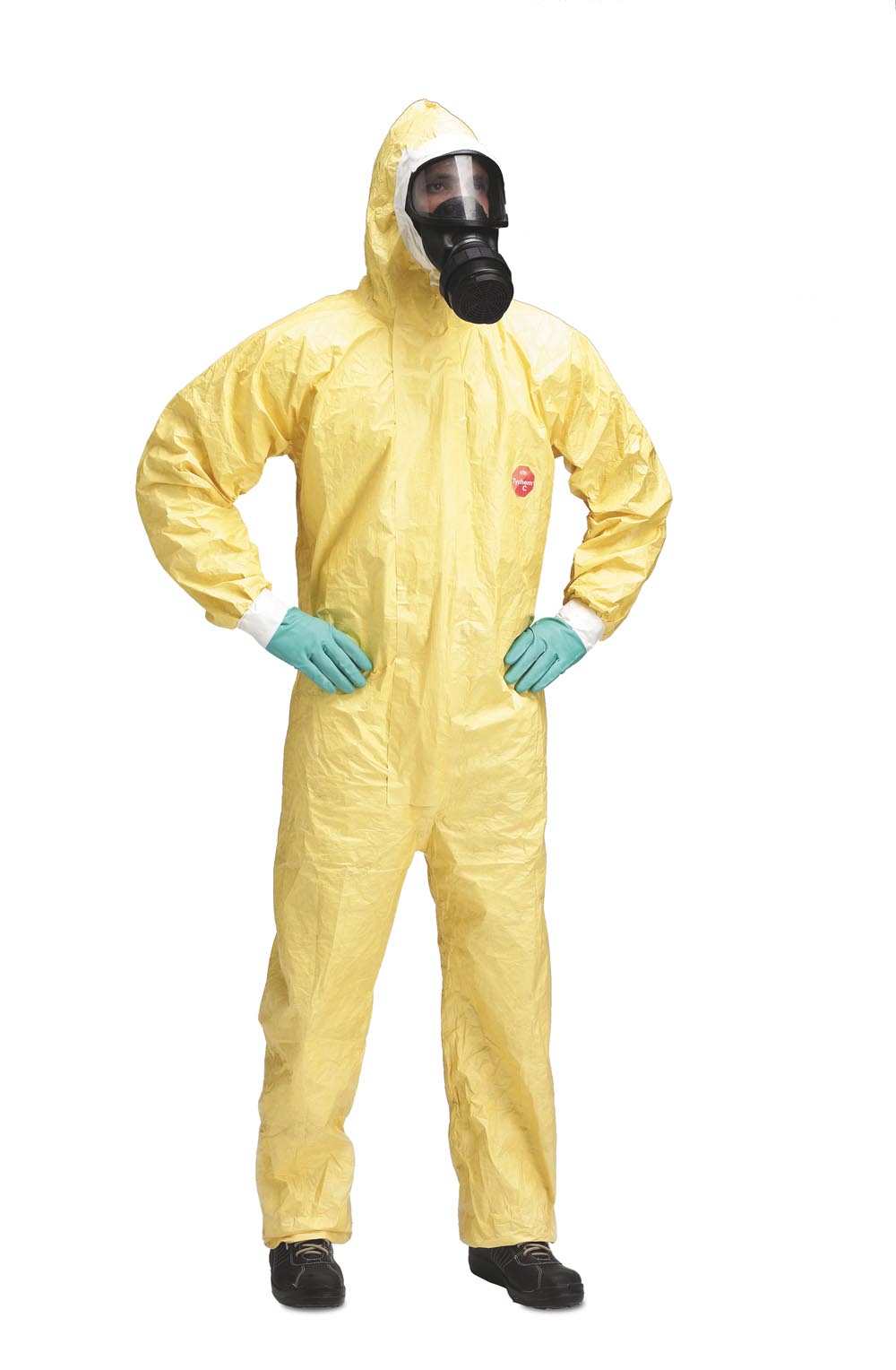 Antistatická voděodolná kombinéza Tychem C (DuPont) s kapucí a přelepenými švy, odolná koncentrovaným anorganickým chemikáliím a ultra jemným částicím, patří do kategorie CE III, typu 3, 4, 5 a 6.