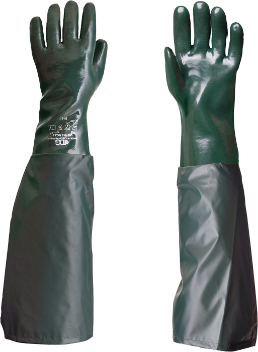 Šitý bavlněný úplet máčený v PVC s nitrilem, ochrana proti mechanickému a chemickému riziku, PVC návlek na paži 65 cm.