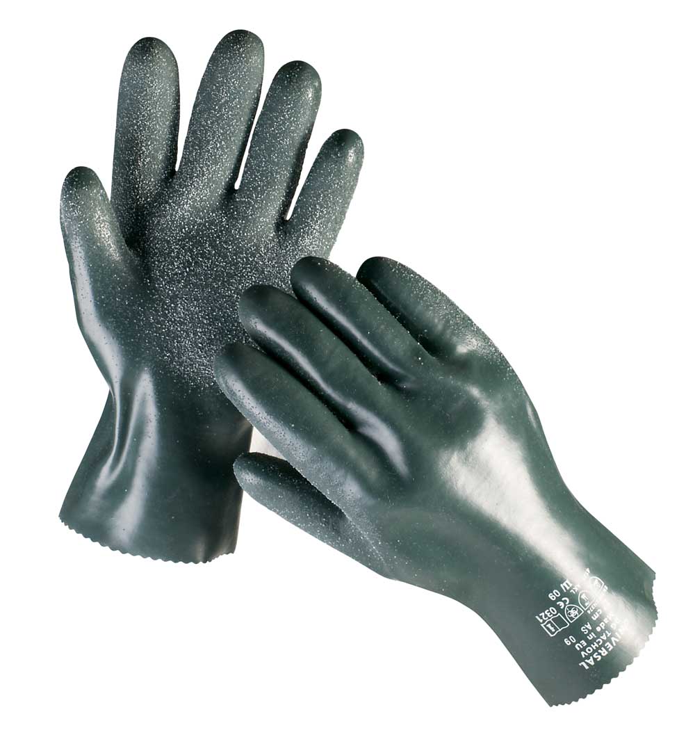Šitý bavlněný úplet máčený v PVC s nitrilem, ochrana proti mechanickému a chemickému riziku, velikosti délka 35cm=7-10, (AS) s posypem v dlani.