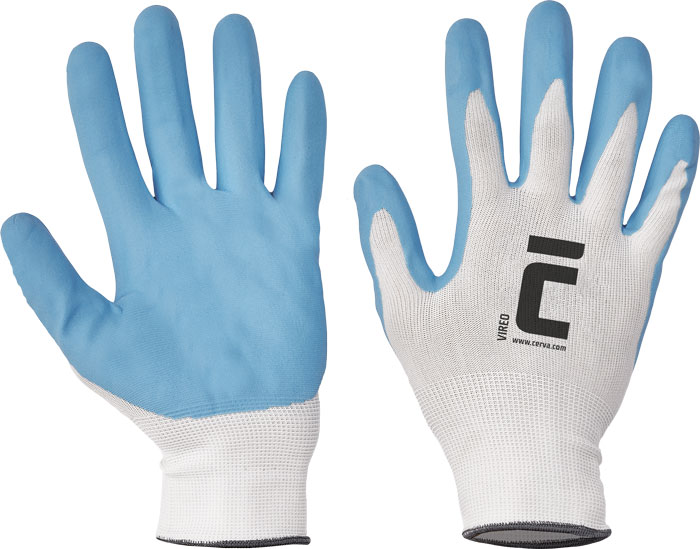 Pletené bezešvé nylonové rukavice s vrstvou mikroporézního paropropustného nitrilu v dlani a na prstech a pružným nápletem.