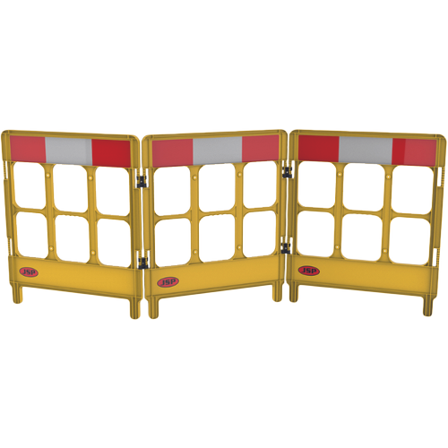 WorkGate® je robustní mini bariéra, sddává se jako verze se 3 nebo 4 branami, které nabízejí velmi univerzální řešení pro mnoho prostředí a požadavků. Reflexní panel Plně reflexní panel splňující požadavky EN 12899-1. Flexibilní propojení Černé přilehlé klipy poskytují flexibilní konfigurace více poloh. Pohodlné rukojeti s tvarovanými úchopy pro prsty usnadňují manipulaci s WorkGate®. Značka dodavatele Velká plocha umožňující použití detailů dodavatele. Volitelné nožky proti zakopnutí vytvářejí stabilnější WorkGate® pro lineární použití. Možnosti WorkGate® lze propojit do čtverce, trojúhelníku nebo do jedné linie, což je praktické pro většinu použití a prostředí. Recyklovatelné Neobsahuje žádné kovové části, takže je ideální pro práci v elektrickém prostředí a snadno se recykluje. Dočasné značení Lokalizační otvory umožňují osazení zdvořilostních nebo pěších značek.