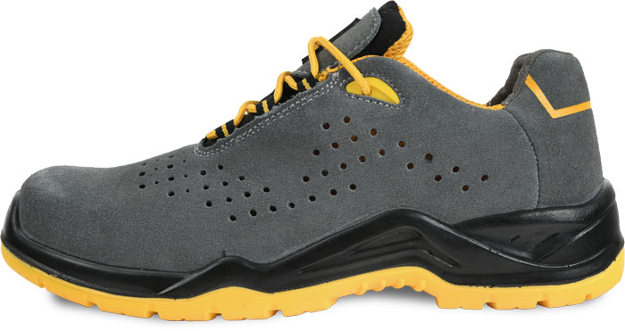 Bezpečnostní polobotka v moderní šedo-žluté barevné kombinaci. Svršek obuvi je vyrobený z nubuk kůže a perforovaný po cele délce. Pr otiskluzová podešev odolná olejům je vyrobena z dvouhustotniho polyuretanu a zajišťuje maximální jistotu při každém kroku. Obuv je vybavena komfortní, perforovanou vnitřní stélkou, která garantuje pohodlí a cirkulaci vzduchu vevnitř boty. Absorpce energie v oblasti paty tlumí nárazy a omezuje pocit únavy nohou. Díky bezpečnostní kompozitní tužince obuv splňuje požadavky normy EN ISO 20345:2011. To znamená, že chodidla jsou chráněna před stlačením silou do 15 kN nebo pádem břemena o vaze do 20kg z výšky 1m. Chodidla jsou chráněna také ze spodu a to díky kompozitní stélce proti propichu. Obuv neobsahuje kovové součásti a je vybavena funkcí ESD. Proto je to ideální model pro vnitřní prostory a citlivé prostředí, kde je potřeba zabránit vzniku jisker z elektrostatického výboje anebo pro prostory vybavené bezpečnostním rámem. Díky minimalistickému designu se