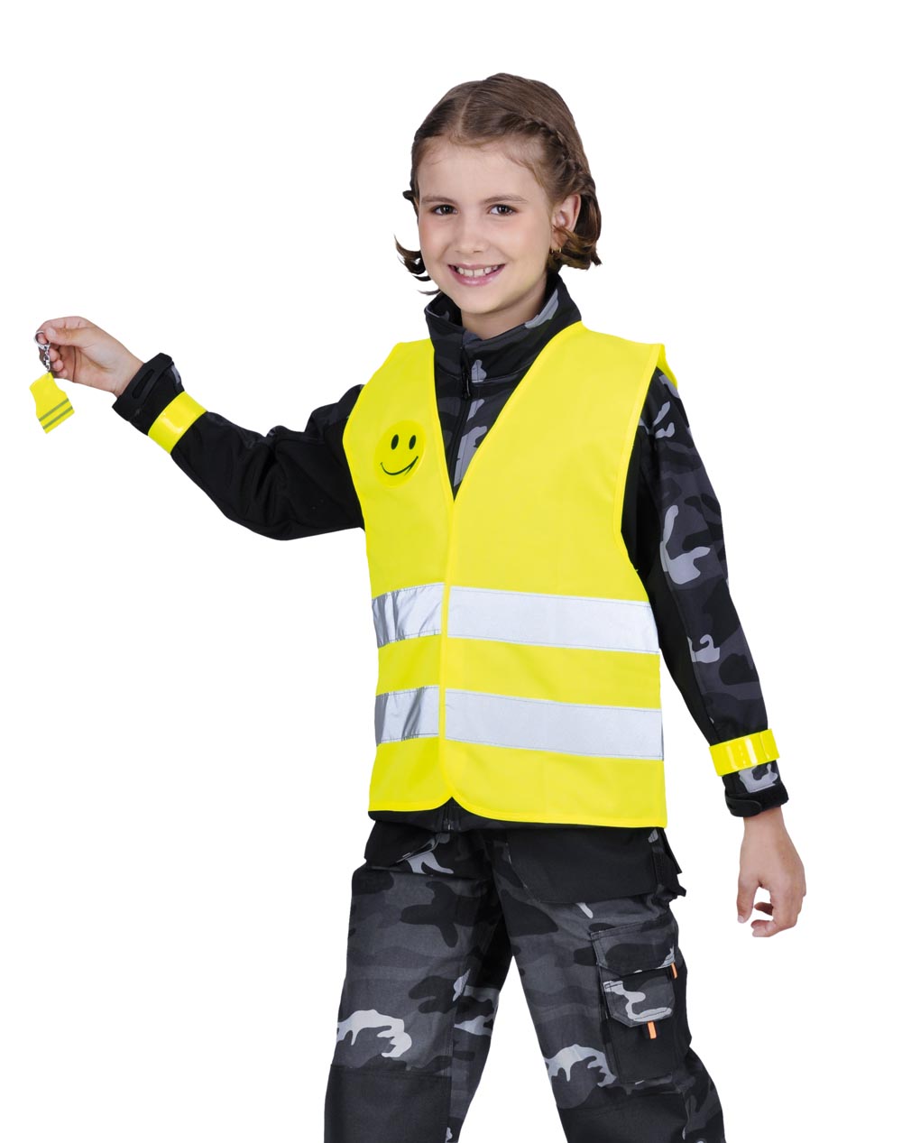• výstražný balíček určený dětem: výstražná vesta, výstražné pásky, výstražná samolepka, výstražná klíčenka • oděv je určen pro děti starší tří let s výškou postavy 120–140 cm k nošení přes svrchní oblečení pro vizuální signalizaci přítomnosti uživatele za jakýchkoli světelných podmínek ve dne i v noci • splňuje normu EN 1150